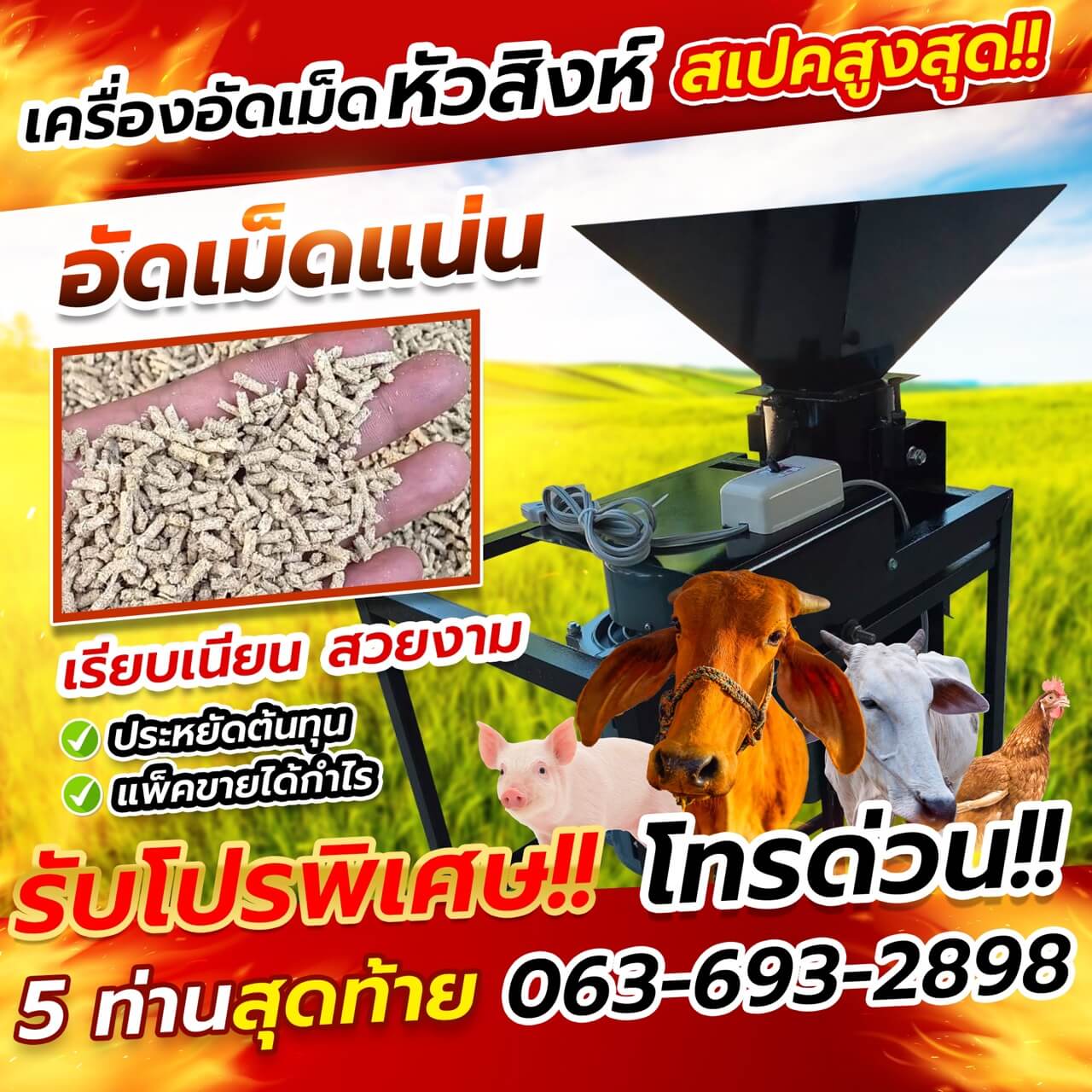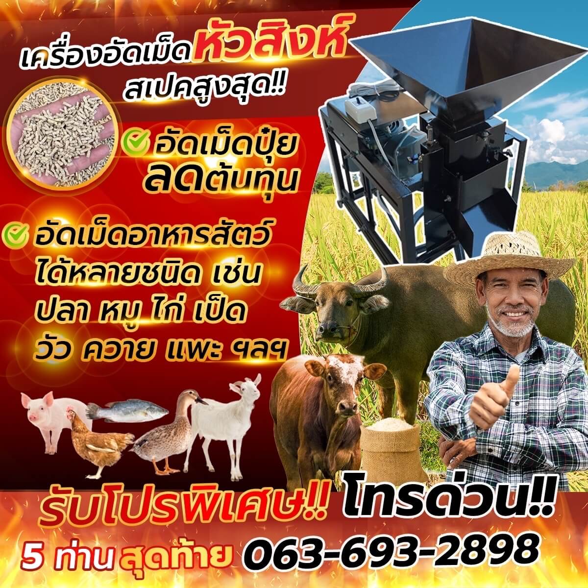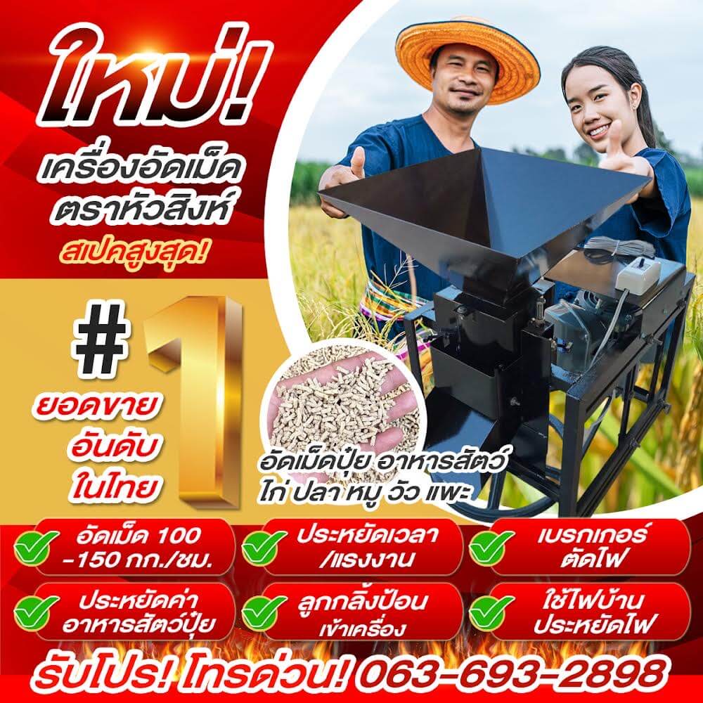 จึงเป็นที่มาของการคิดค้น เครื่องอัดเม็ดอาหารสัตว์ หรือเครื่องอัดเม็ดปุ๋ย สเปกสูงสุด หัวสิงห์ เพื่อพี่ๆ น้องๆ เกษตรกร โดยพัฒนา เครื่องอัดเม็ดอาหารสัตว์ หรือเครื่องอัดเม็ดปุ๋ย สเปกสูงสุด หัวสิงห์ ให้มีประสิทธิภาพการทำงาน และอัตราการผลิตที่สูง ช่วยเกษตรกร ลดต้นทุนในการ ผลิตอาหารสัตว์อัดเม็ด ปุ๋ยอัดเม็ด เพิ่มผลผลิตทางการเกษตรให้พืชโตเร็ว และเพิ่มรายได้ให้กับเกษตรกรไทยอย่างยั่งยืน